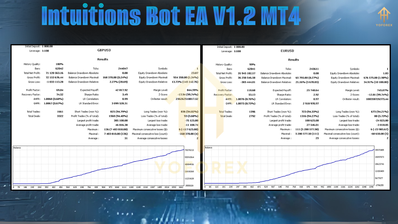 To validate the robustness of Intuitions Bot EA V1.2 MT4, our backtests span a six-year period from January 2018 to December 2023, across five major currency pairs on the H1 timeframe. Here’s a summary of the results: