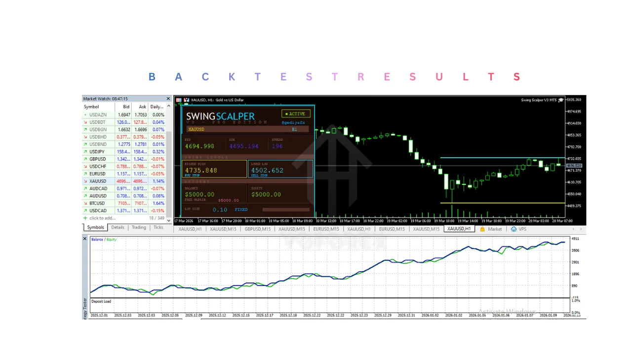 Allow us to don our proverbial top hats and monocles for a moment of mock-formal elucidation on the Swing Scalper MT5, that paragon of programmatic prowess in the MT5 ecosystem. At its core, this EA is a hybrid marvel, fusing the stately art of swing trading—holding positions for days to capture medium-term trends—with the frenetic ballet of scalping, snatching tiny profits from fleeting price fluctuations. Developed by a shadowy cabal of coding connoisseurs (or so the legend goes), it's tailored exclusively for MetaTrader 5, leveraging MQL5's robust framework to execute trades with the speed of a caffeinated cheetah.