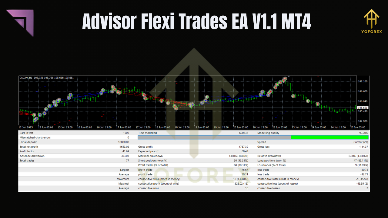 Flexi Trades EA V1.1 is an advanced MetaTrader 4 (MT4) Expert Advisor designed to adapt its strategy based on live market conditions. This isn’t your typical static EA that just enters on crossovers or RSI levels. Instead, it actively reads market volatility, recent candle patterns, and support/resistance levels to find high-probability entries.