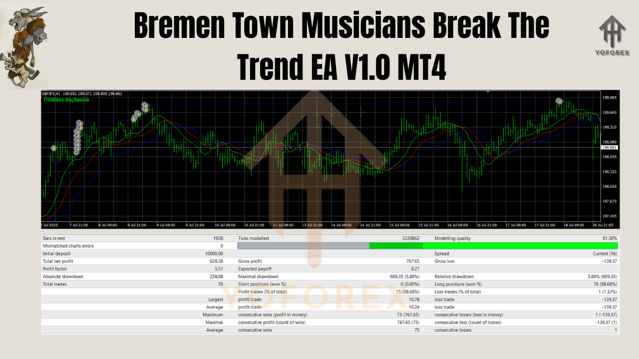 Bremen Town Musicians Break The Trend EA V1.0 MT4 is for traders who don’t blindly follow trends—they wait for the crack, then strike.