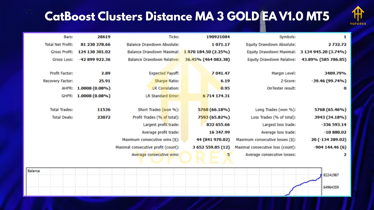 Developed by YoForex and released exclusively on ForexFactory.cc, this EA combines distance-based clustering algorithms with MA-3 crossover filters to make calculated, low-risk trades on XAUUSD (Gold). It’s designed for the MT5 platform and optimized for H1 and M15 timeframes, making it ideal for swing-scalping and short-term setups.