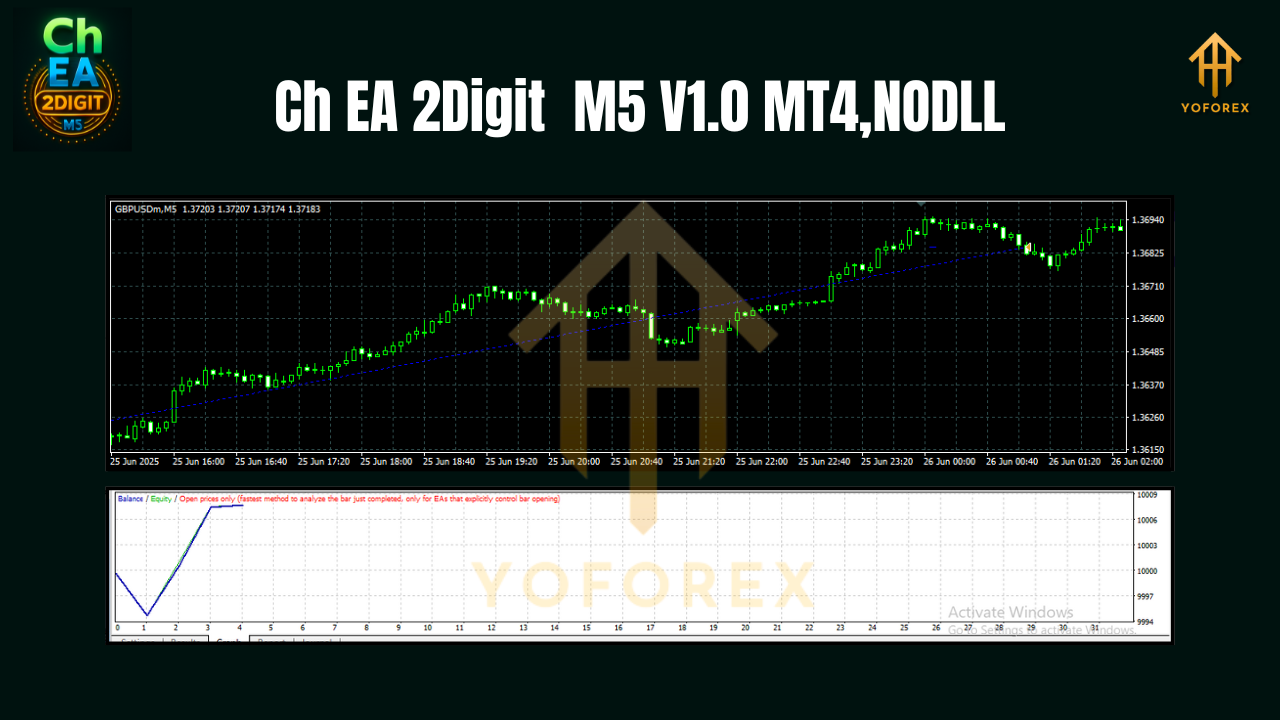 The Ch EA 2Digit M5 V1.0 MT4 works by analyzing market conditions on the M5 timeframe and executing trades based on predefined conditions. Its algorithm detects market trends and momentum, allowing it to open positions when the market is favorable for short-term gains. The EA uses a two-digit logic to ensure rapid execution and precise decision-making, which is key for scalping.