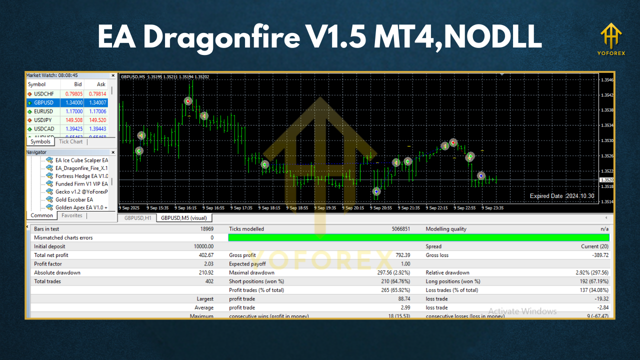 Backtests show that Dragonfire V1.5 delivers an average monthly growth between 7–12%, depending on broker conditions and risk settings. The EA maintained a drawdown under 10%, proving its stability.
