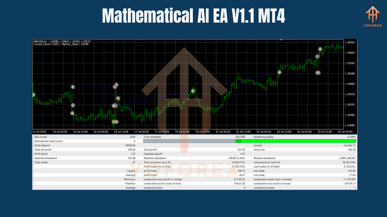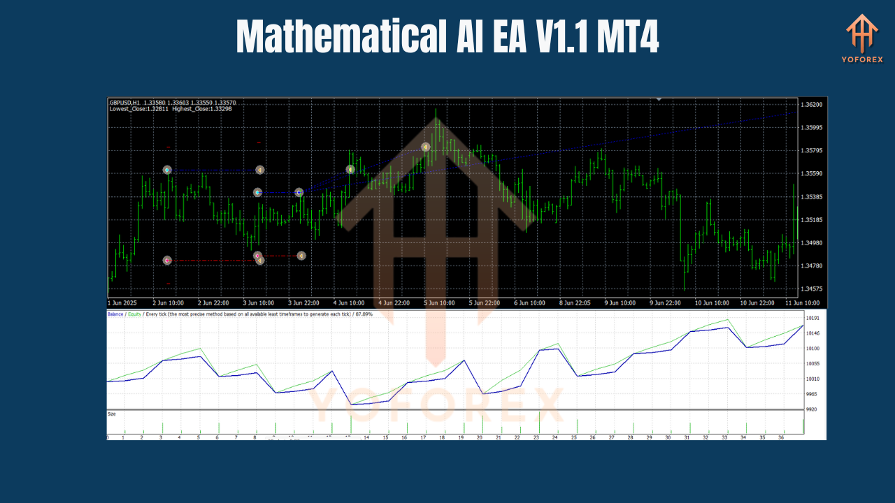 That’s the idea behind the Mathematical AI EA V1.1 MT4. Powered by YoForex, this unique expert advisor uses mathematical equations and AI-driven logic to place trades on both sides of the market. Instead of guessing direction, it adapts dynamically to whichever way price moves — capturing profits in both bullish and bearish conditions.