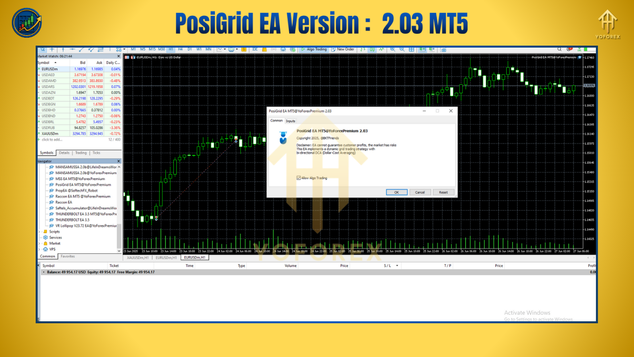 Enable Algo Trading (press the “Algo Trading” button), and let PosiGrid EA V2.03 MT5 run 24/5—even when you’re away.