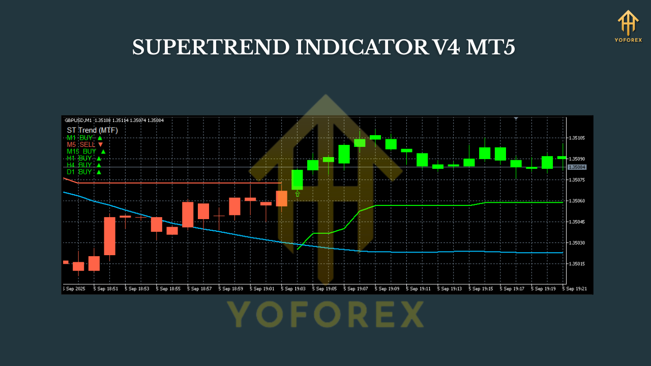 The SUPERTREND INDICATOR V4 MT5 is a trend-following indicator built for MetaTrader 5 traders. It calculates trend direction using ATR (Average True Range) and moving averages under the hood, but all you see is a clean line on the chart that flips color depending on where price is trading.