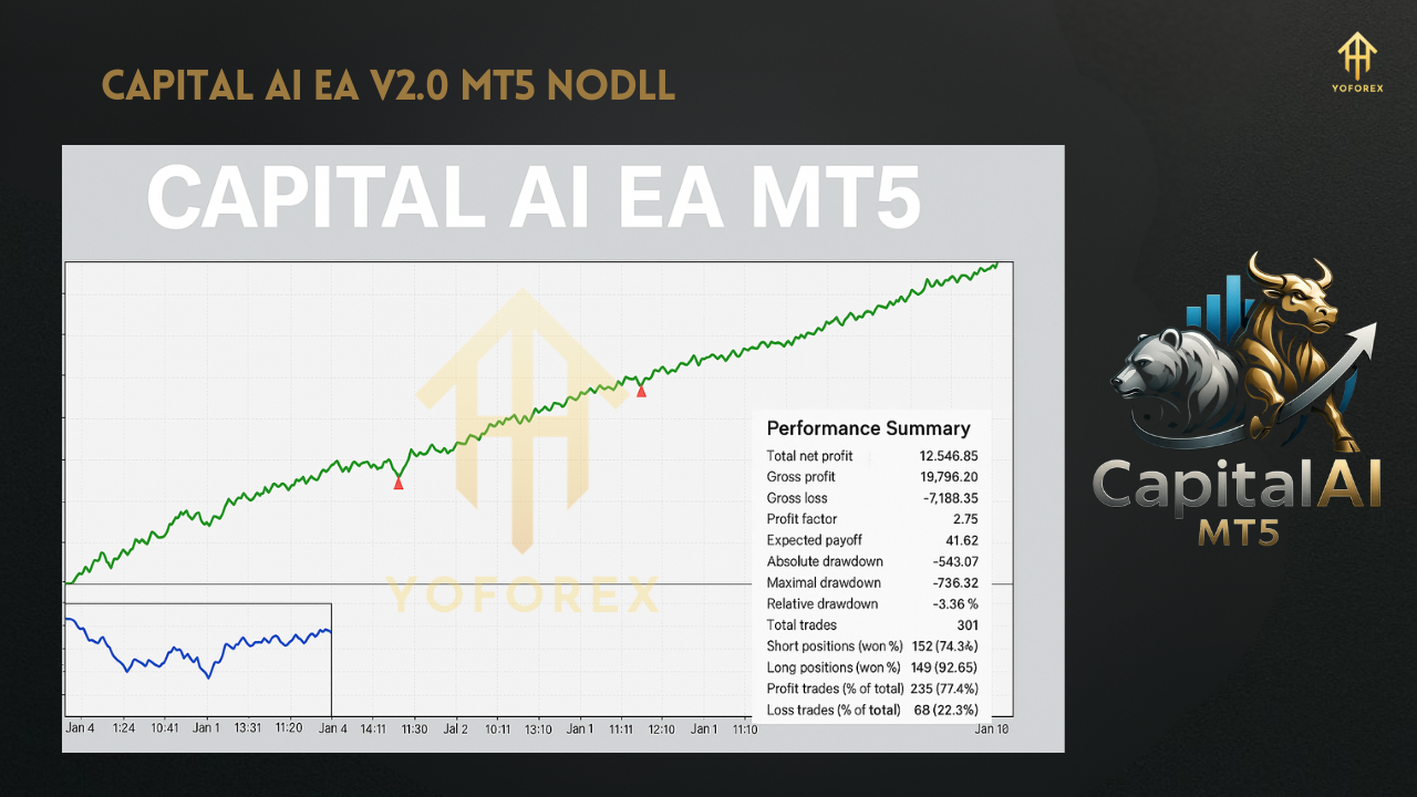 Sick of staring at charts all day and chasing lagging signals? Me too… which is exactly why the CAPITAL AI EA V2.0 MT5 exists. Hosted 100% free on ForexFactory.cc and battle-tested by YoForex, this AI-driven MT5 expert advisor uses neural networks to adapt in real time, hunting for high-probability trades across major pairs. No martingale, no grid, just pure machine-learning muscle under the hood. In this blog, we’ll dive into how it works, peek at our backtest and live-demo results, and show you how to set it up on your MetaTrader 5 in under a minute. Ready? Let’s go!