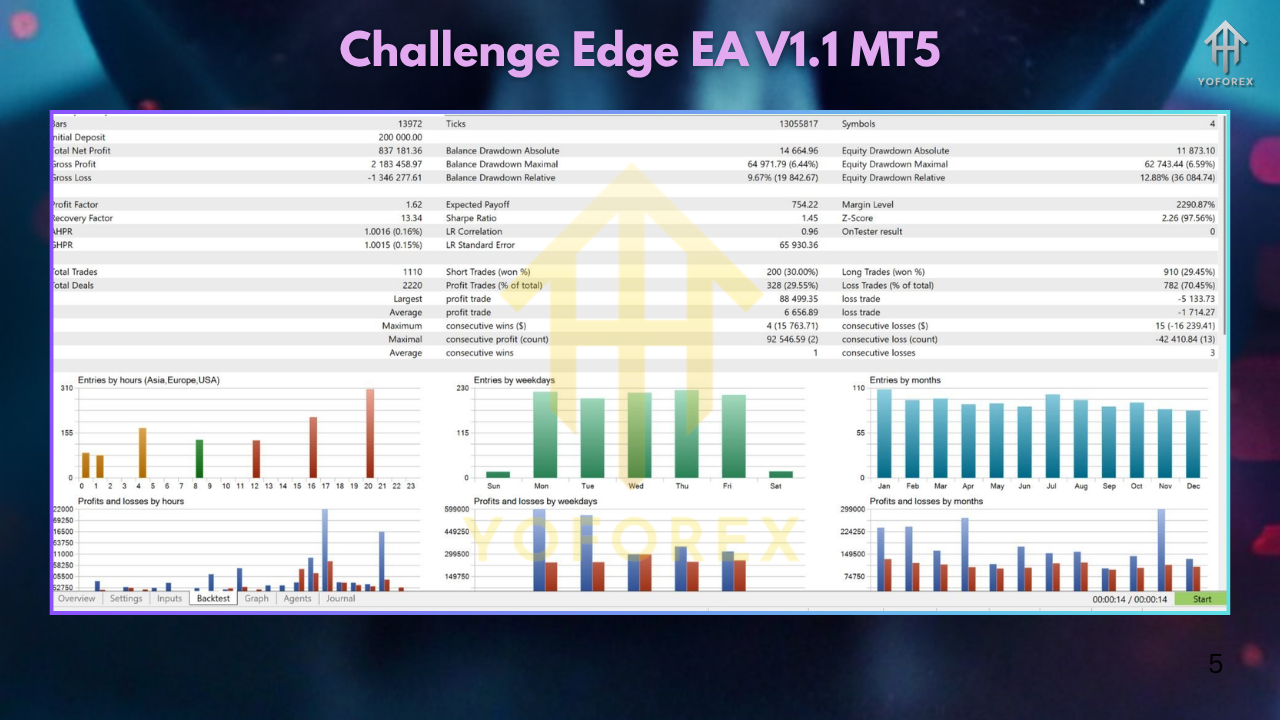 Unlike flashy systems that chase unrealistic win rates, Challenge Edge EA V1.1 MT5 blends steady trade frequency, strict capital protection, and adaptive equity balancing. It’s built for those who crave measurable edge rather than luck. YoForex’s dev team back-tested, forward-tested, and optimized it to handle both low-volatility markets and explosive macro sessions.