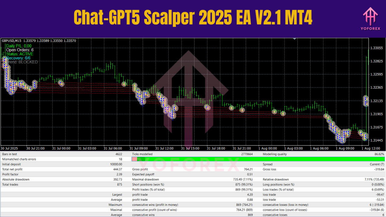 The Chat-GPT5 Scalper 2025 EA V2.1 MT4 is an advanced AI-based scalping bot that combines deep-learning-inspired algorithms with classic technical filters.