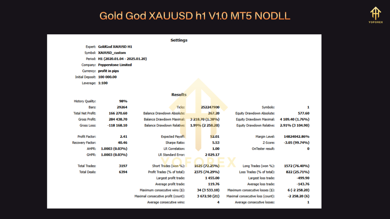 Gold God XAUUSD H1 V1.0 MT5 is built to provide gold traders with automation, security, and strategic accuracy. If you want to level up your gold trading without staring at charts all day, this EA delivers the reliability and structure you need.