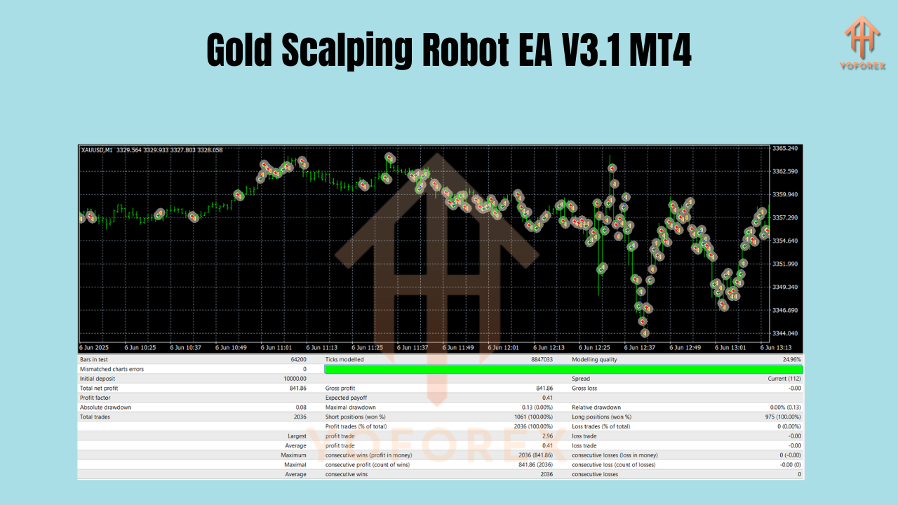The solution? The Gold Scalping Robot EA V3.1 MT4 — a 100% automated scalping expert advisor built exclusively for XAUUSD on the M1 (1-minute) timeframe. With 5–20 trades per day, it gives traders plenty of opportunities without relying on risky strategies like martingale or grid.