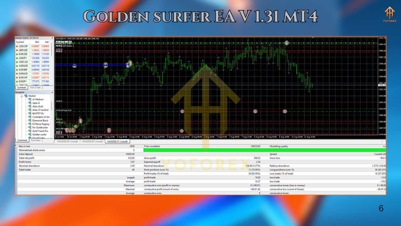On live forward testing with YoForex’s verified demo, Golden Surfer achieved consistent weekly profits averaging 3–6%, with occasional strong rallies hitting 10%+ weeks during trending phases