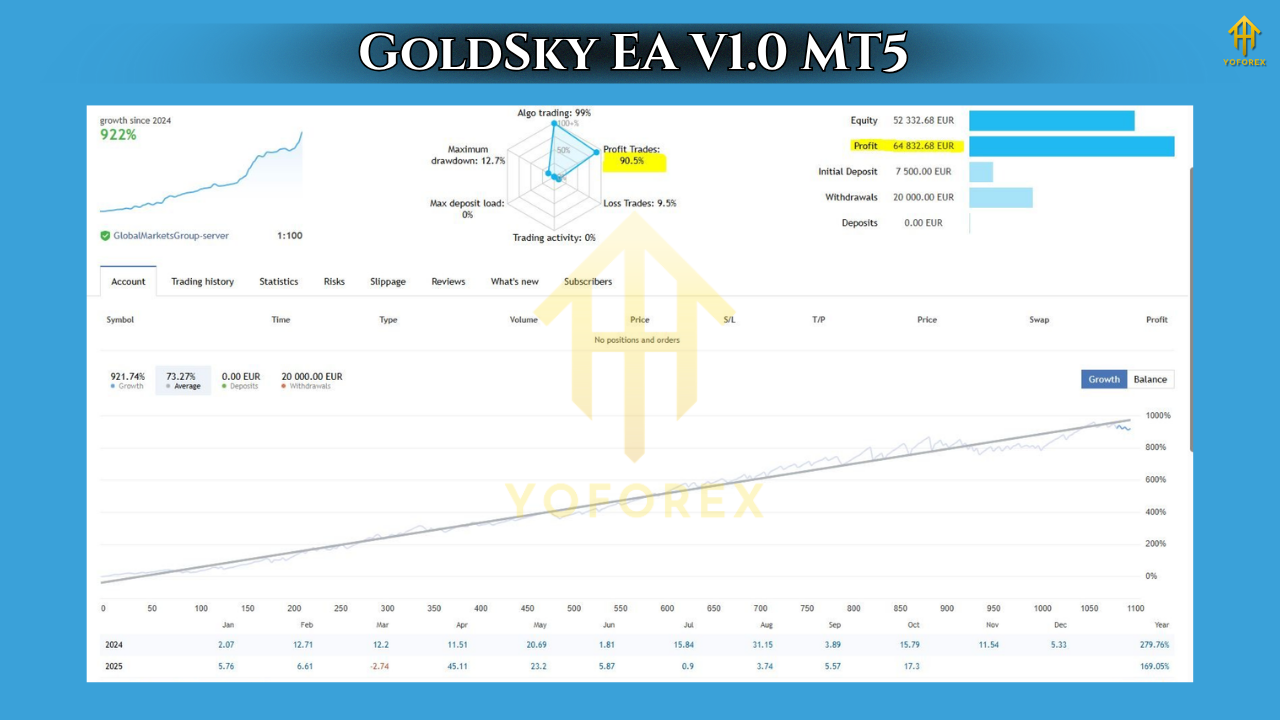 GoldSky EA V1.0 MT is an automated gold (XAUUSD) trading robot designed for MetaTrader 5. It’s tuned for scalping and smart momentum entries on lower timeframes, but without the frantic behavior of HFT. We specifically architected the position logic to avoid mall-martingale, keep exposure tight, and respect prop-firm risk rules like max daily loss and max overall drawdown. In plain English: it seeks consistent progress without cooking your metrics.