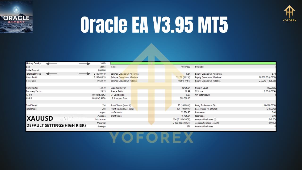 Oracle EA V3.95 MT5 is designed to provide dependable and consistent trading results on two of the most traded assets in forex: GBPUSD and XAUUSD (Gold). Built on MetaTrader 5, this bot uses a combination of proprietary machine learning models and technical indicators to find high-probability trades.