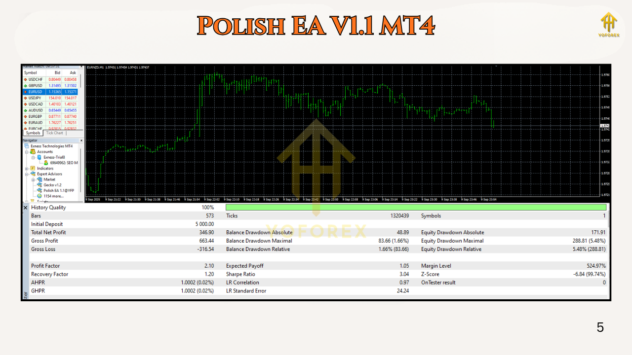 In live forward tests (YoForex verified accounts), Polish EA maintained a steady win/loss ratio and consistent month-over-month returns.