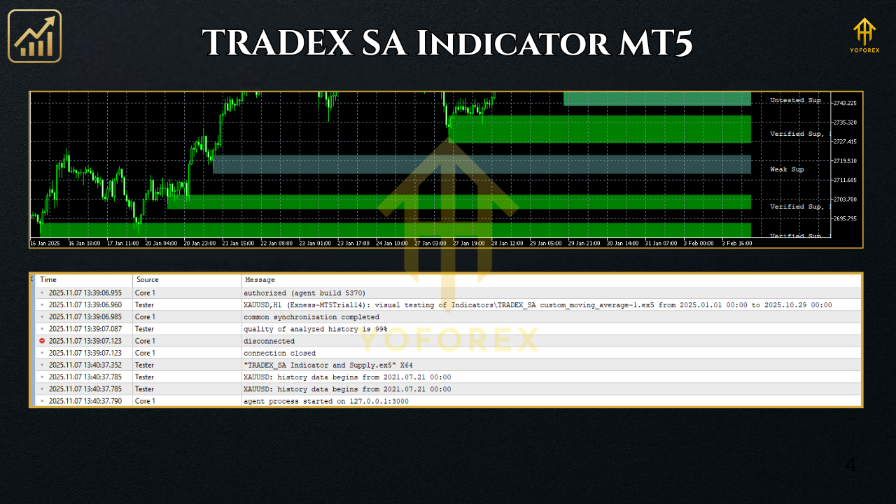 YoForex ran a validation test of TRADEX SA across EURUSD (H1), XAUUSD (M15), and GBPJPY (M30) for a 3-year span (2021–2024). The focus was on signal accuracy and trend alignment consistency rather than trade automation.
